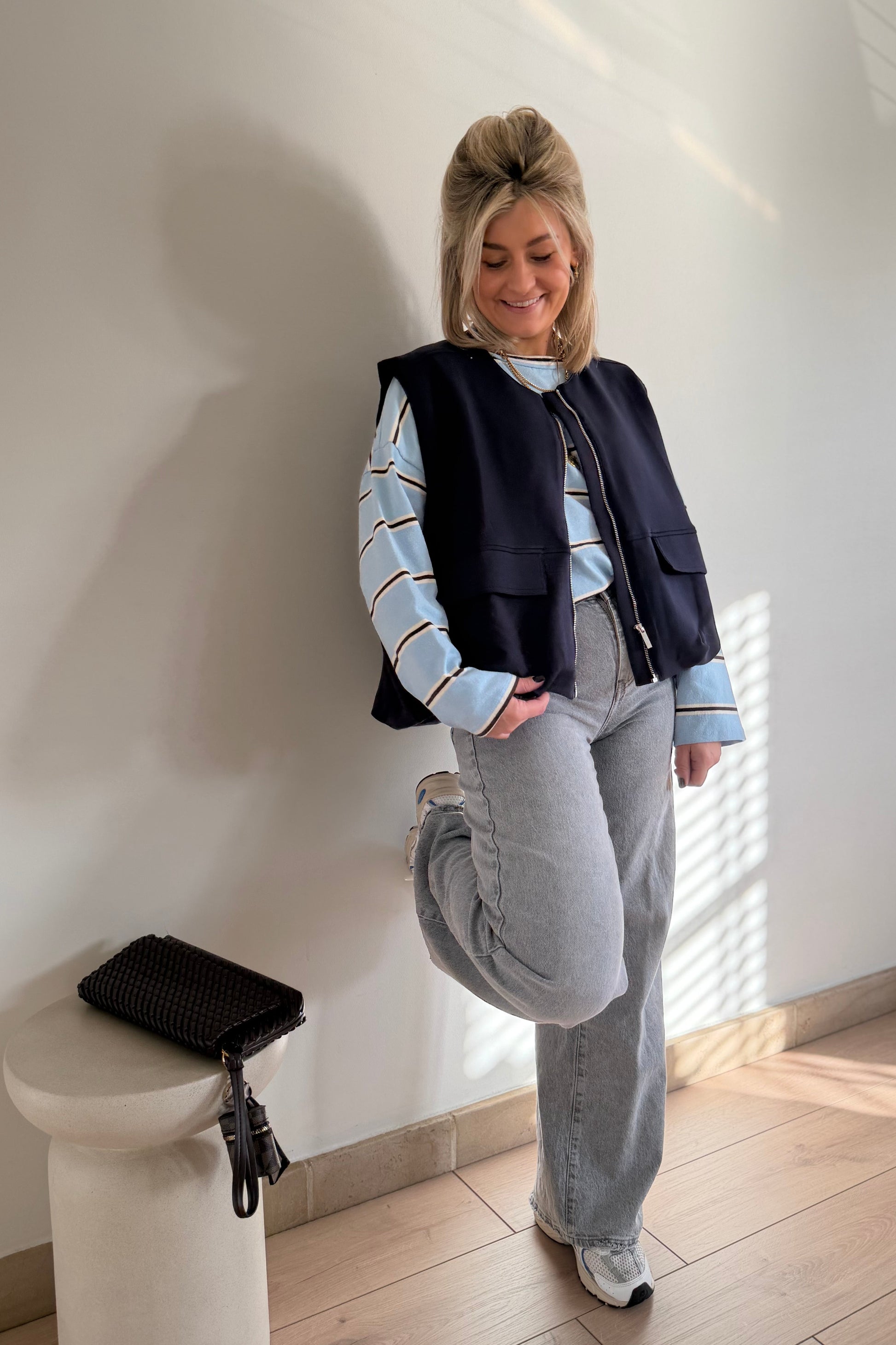 Longsleeve truitje tussen sweater en t-shirt. Oversized fit, verlaagde schoudernaden en speelse contrasterende strepen. De supermooie lichtblauwe kleur zorgt meteen voor een vrolijke touch in je outfit en is prachtig te combineren met denim, wit of grijs.