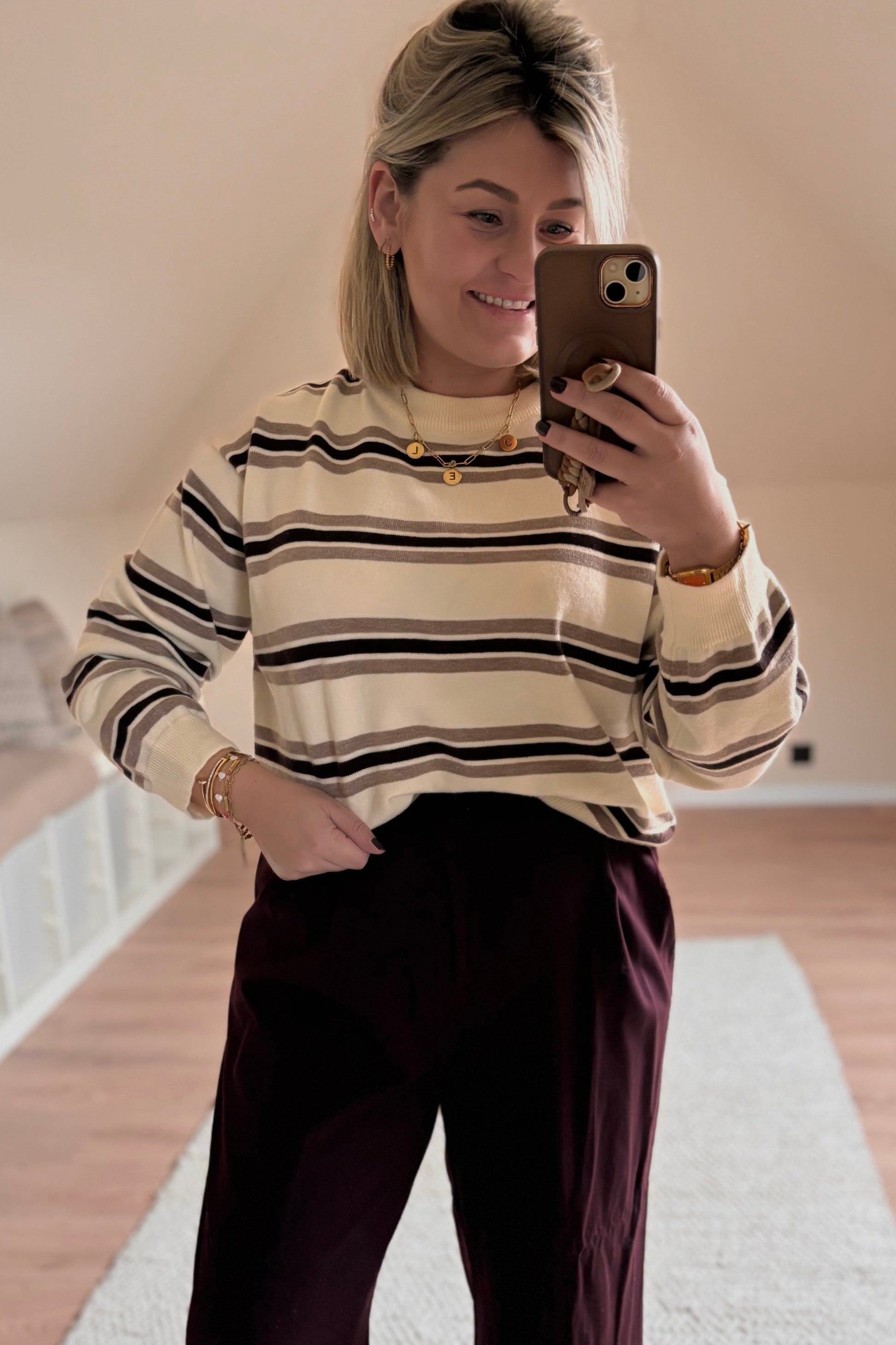 Gestreept fijngebreid truitje in kleuren creme - bruin.
